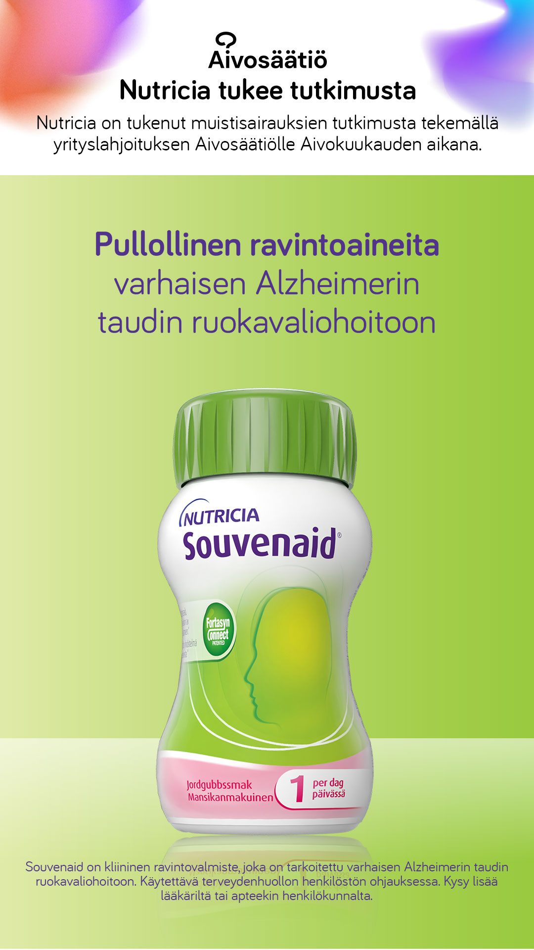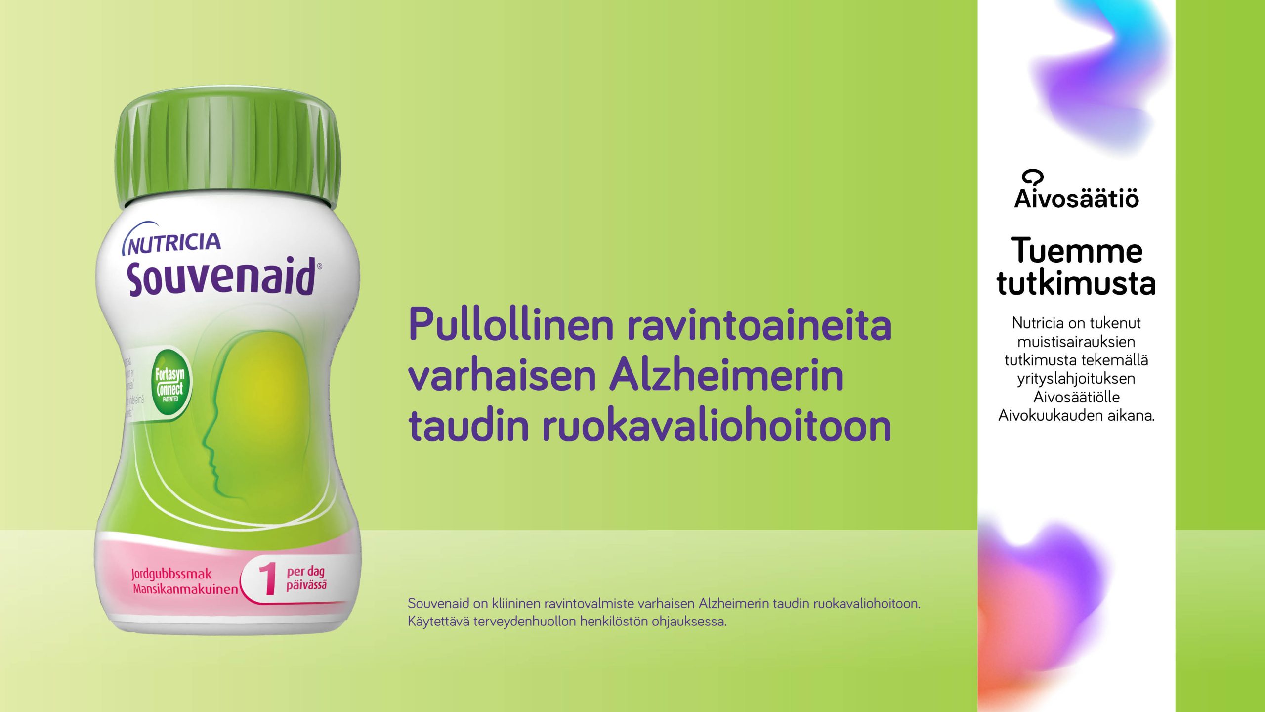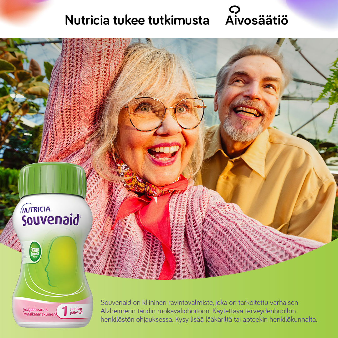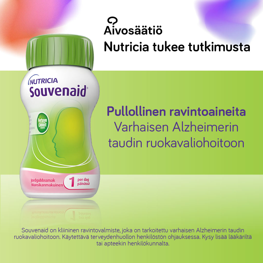 Nutricia on tehnyt yrityslahjoituksen Aivosäätiölle muistisairauksien tutkimuksen tukemiseen. Myös Souvenaidin ainutlaatuista ravintoaineyhdistelmää on tutkittu yli 20 vuotta. Tukemalla muistisairauksien tutkimusta voimme olla mukana muuttamassa tulevaisuutta.